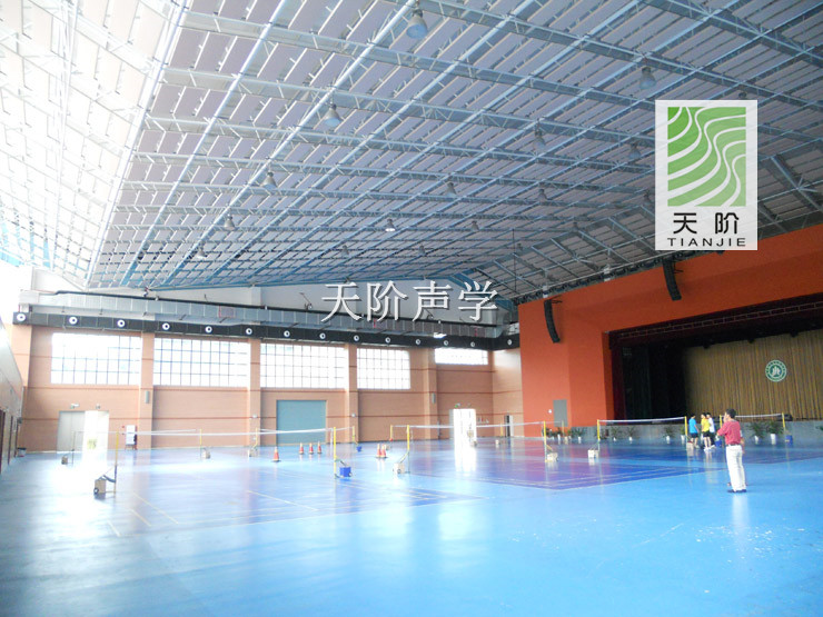 同時(shí)體育館頂棚也裝有具高效天階平板吸收性能的空間吸聲體。天階平板空間吸聲體是由優(yōu)質(zhì)玻璃纖維棉、定制鋁質(zhì)邊框、吸音防塵玻纖布組成。它是其他聲學(xué)材料吸聲行能的2倍。從而大大減少了體育館的回聲。