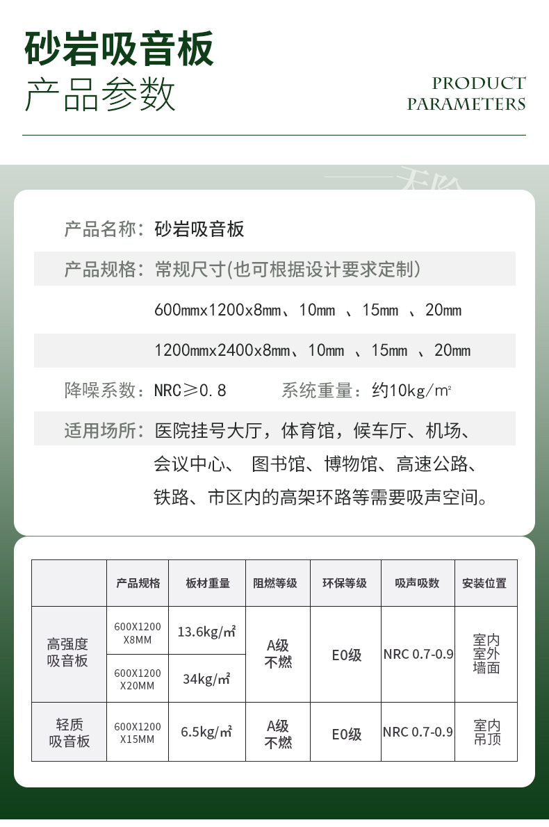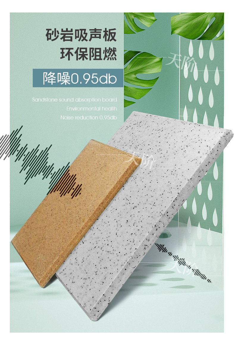 砂巖吸音板,它的基材有兩種,一種是具有吸聲防火**的強化玻纖板為基材,這種基材為大家所熟知,也是很多設計師慣用的一種高端吸聲材料;另外一種基材是由特定直徑的輕質砂粒為原料,通過聚合技術使每個顆粒之間如焊接般聚合在一起,由于無機顆粒的表面不規(guī)則形狀或聚合空隙,微粒之間形成了大量不規(guī)則且互相連通的微觀孔隙結構。