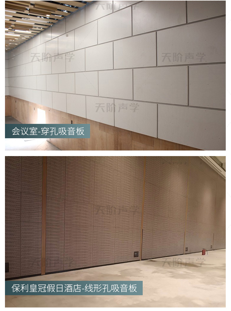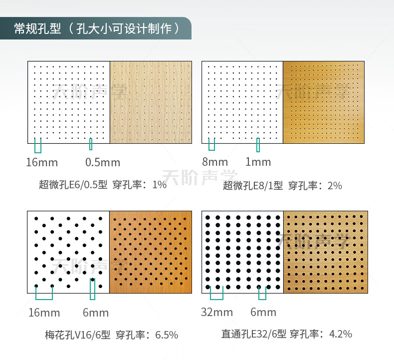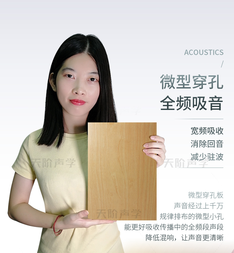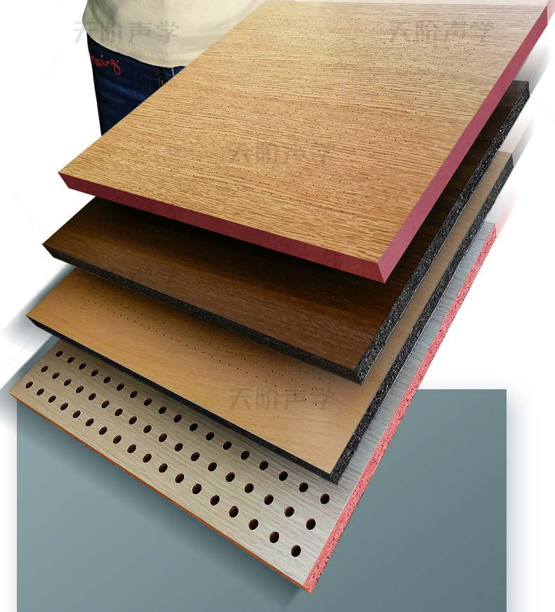 孔木吸音板是一種在密度板上直接穿孔的共振吸聲材料??啄疚舭鍖?duì)吸聲頻譜選擇性較強(qiáng),對(duì)低頻有很好的吸聲性能。如在吸聲結(jié)構(gòu)后空腔上填入適量的吸聲棉可提高中、高頻吸聲效果。 我們的孔木吸音板: 天階聲學(xué)孔木吸音板采用高質(zhì)的中纖板、具有環(huán)保、防火、防潮等性能,飾面顏色及材料選擇性廣,能很好地滿足客戶多樣化的聲學(xué)及裝飾需求。較槽木吸音板,孔木吸音板相對(duì)抗撞擊能力強(qiáng)。