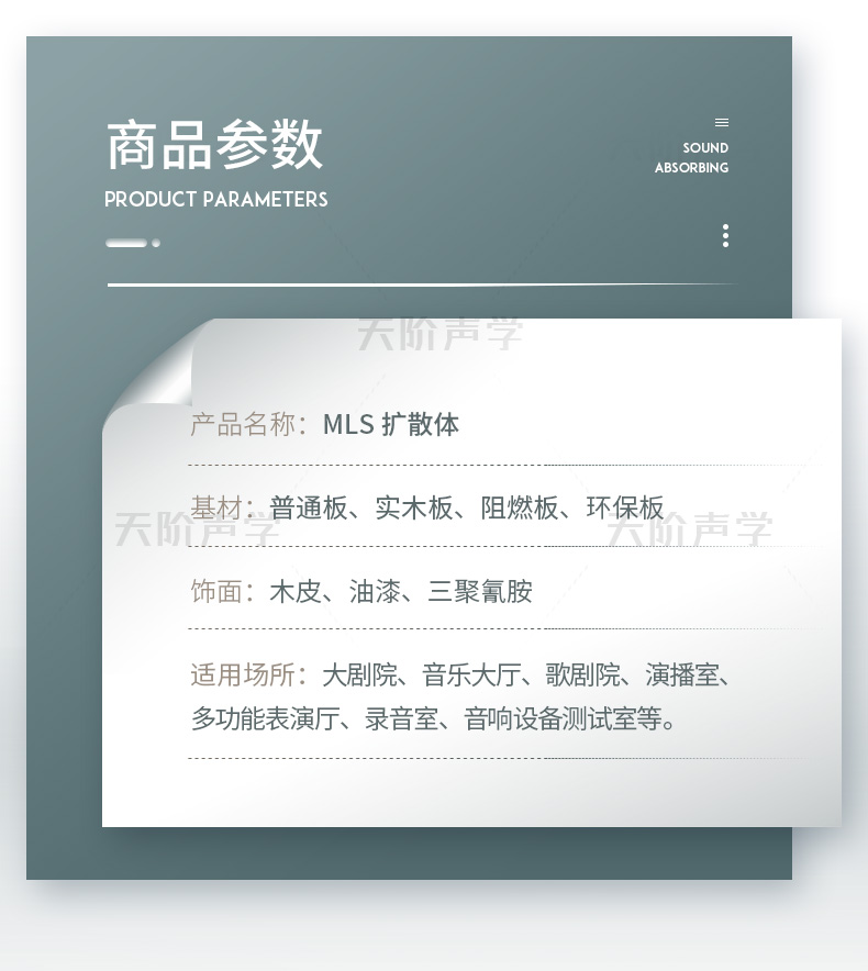擴(kuò)散是指聲音朝著許多方向不規(guī)則反射、折射和衍射的現(xiàn)象。擴(kuò)散對(duì)“豐滿度”、“活躍度”、“空間感”是有利的,并且能保持豐滿和明晰度之間的平衡,語言清晰度和較長(zhǎng)混響時(shí)間之間的平衡,還可以保持觀眾廳內(nèi)音調(diào)的自然性??梢宰屖覂?nèi)聲能分布均勻,清除回聲等。室內(nèi)擴(kuò)散不好,音色往往很粗糙。擴(kuò)散體就是為改進(jìn)聲場(chǎng)擴(kuò)散性能所采用的布置,設(shè)計(jì)依據(jù)是利用不規(guī)則界面改變發(fā)射聲的波前,或者改變聲阻抗。