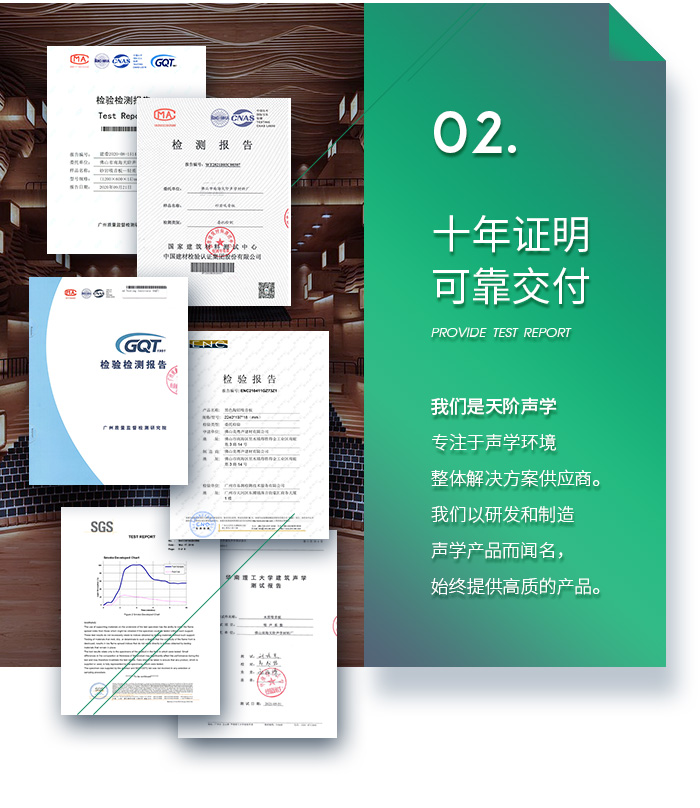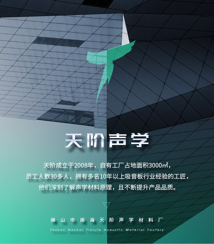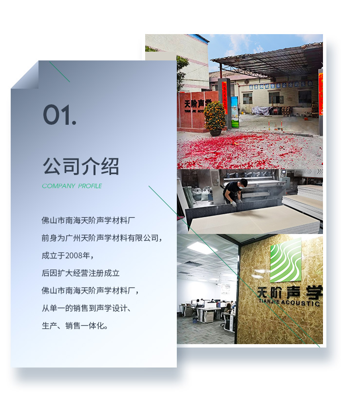 佛山市南海天階聲學(xué)材料廠前身為廣州天階聲學(xué)材料有限公司,成立于2008年,后因擴(kuò)大經(jīng)營注冊成立佛山市南海天階聲學(xué)材料廠,工廠占地3000多平米,從單一的生產(chǎn)銷售到:聲學(xué)設(shè)計(jì)-生產(chǎn)-銷售-聲學(xué)工程施工一體化,是一家專業(yè)的聲學(xué)環(huán)境解決方案綜合服務(wù)商。