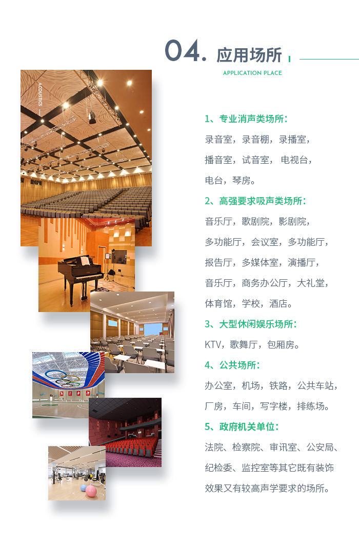 2、高強(qiáng)要求吸聲類場所:歌劇院,影劇院,多功能廳,會議室,多功能廳,報(bào)告廳,多媒體室,演播廳,音樂廳,商務(wù)辦公廳,大禮堂,體育館,學(xué)校,酒店。