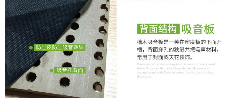 穿孔木質(zhì)吸音板是一種在密度板上直接穿孔的共振吸聲材料。穿孔木質(zhì)吸音板對(duì)吸聲頻譜選擇性很強(qiáng),對(duì)中低頻有很好的吸音性能。如在吸聲結(jié)構(gòu)后空腔上填入適量的吸聲棉可提高中、高頻的吸聲效果。