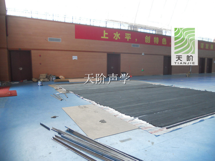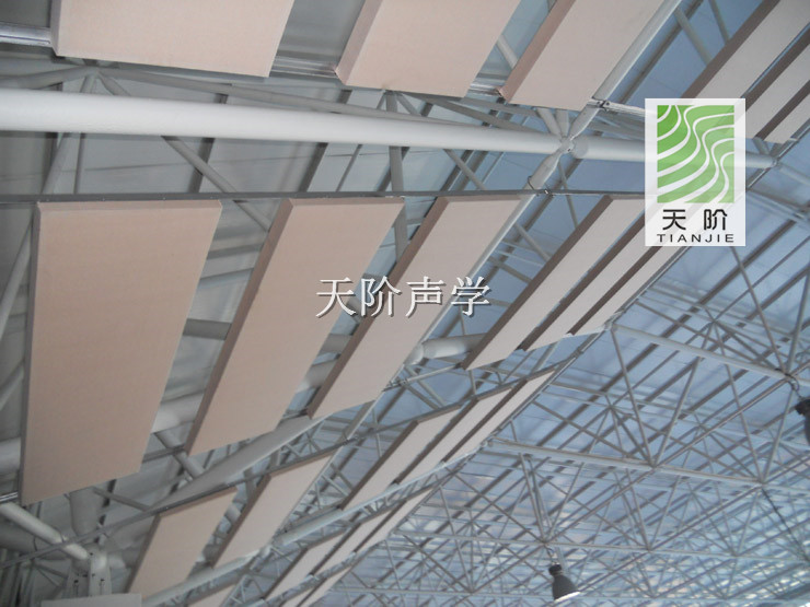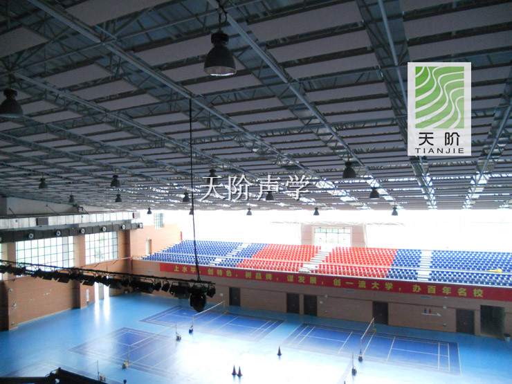 同時(shí)體育館頂棚也裝有具高效天階平板吸收性能的空間吸聲體。天階平板空間吸聲體是由優(yōu)質(zhì)玻璃纖維棉、定制鋁質(zhì)邊框、吸音防塵玻纖布組成。它是其他聲學(xué)材料吸聲行能的2倍。從而大大減少了體育館的回聲。