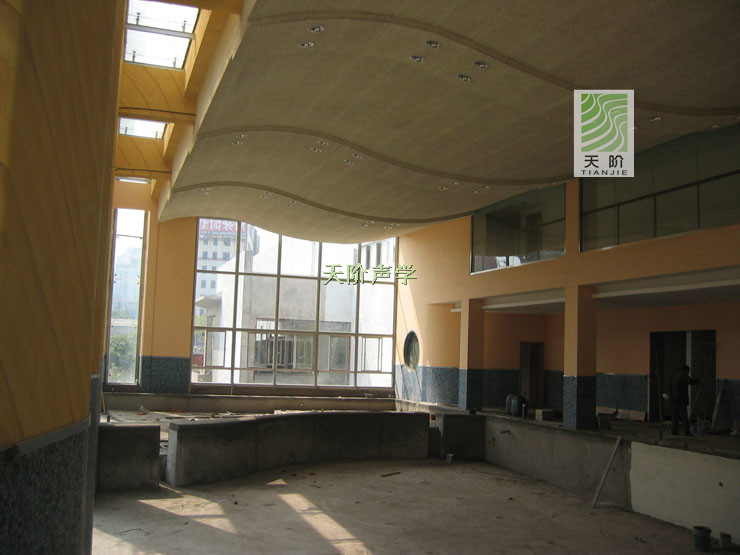 上海大學(xué)游泳館工程使用了1200方的木絲吸音板,安裝在天花,不僅美觀。對各種頻段的吸聲效果的很明顯,可以有效避免回聲。