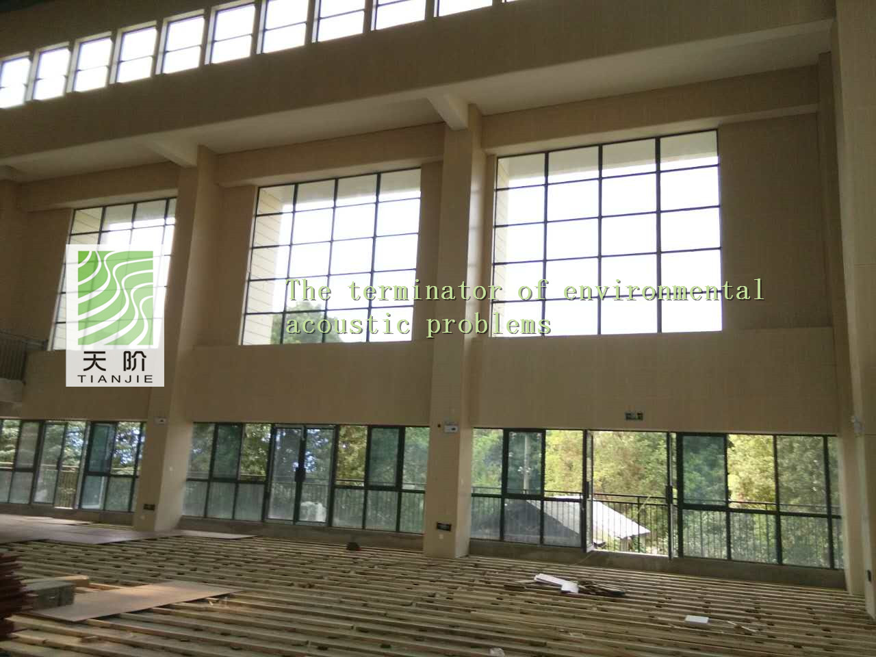 找了聲學(xué)專(zhuān)家對(duì)籃球館進(jìn)行了聲學(xué)設(shè)計(jì),采用了槽木吸音板。