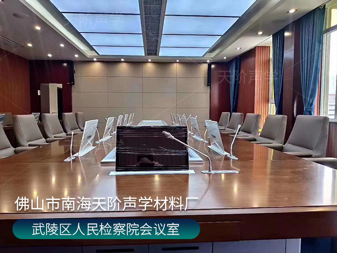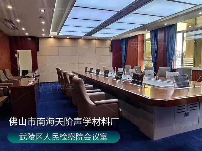 武陵區(qū)人民檢察院會議室,墻面使用槽木吸音板,選用不燃陶鋁板基材;加入軟包吸音板,高雅又有格調(diào),消除回音和雜音。