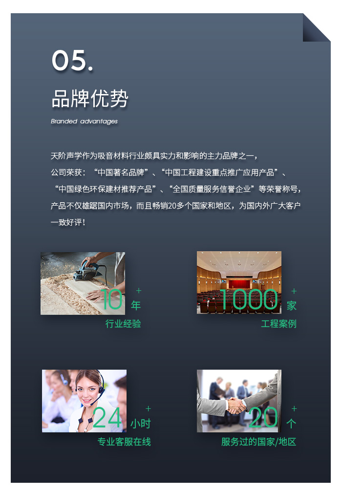 佛山市南海天階聲學(xué)材料廠作為當(dāng)今中國吸音材料行業(yè)具有實(shí)力和影響的主力品牌之一,公司榮獲:“中國著名品牌”、“中國工程建設(shè)重點(diǎn)推廣應(yīng)用產(chǎn)品”、“中國綠色環(huán)保建材推薦產(chǎn)品”、“全國質(zhì)量服務(wù)信譽(yù)企業(yè)”、等榮譽(yù)稱號,產(chǎn)品不僅雄踞國內(nèi)市場,而且暢銷多個國家和地區(qū),為國內(nèi)外廣大客戶一致好評!