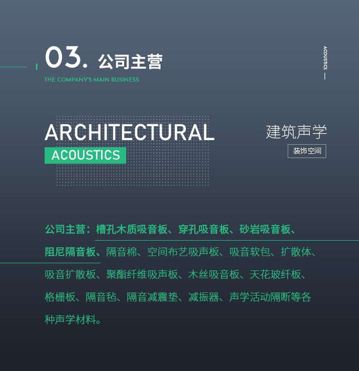 公司主營:槽孔木質(zhì)吸音板、陶鋁吸音板、砂巖吸音板、布藝吸聲板、吸音軟包、微孔吸音板、碳塑吸音板、聚酯纖維吸聲板、隔音板、隔音氈、隔音減震墊、減振器,干掛板與聲學(xué)活動隔斷、固定高隔間等各種聲學(xué)材料。