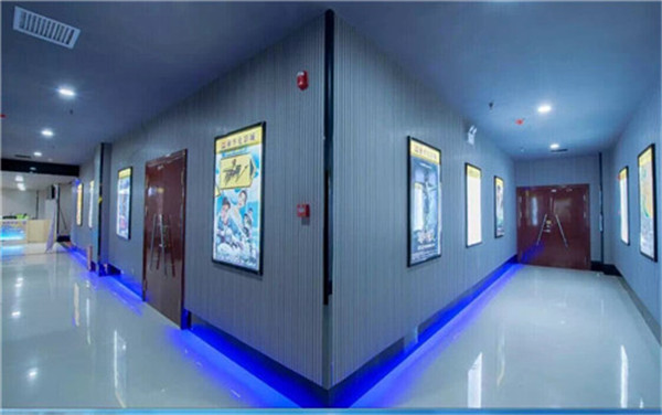 。電影院收銀臺墻面與吊頂位置采用生態(tài)木穿孔吸音板、影城走廊兩側(cè)采用環(huán)保13/3槽孔吸音板。影視廳內(nèi)墻面采用聚酯纖維吸音板。聚酯纖維吸音板共用800┫,環(huán)保槽孔吸音板210平方米,生態(tài)木穿孔吸聲板185平方米。