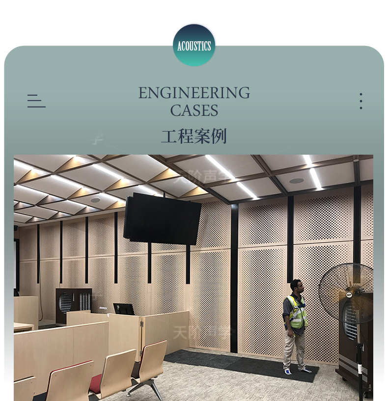 天階聲學(xué)孔木吸音板采用高質(zhì)的中纖板、具有環(huán)保、防火、防潮等性能,飾面顏色及材料選擇性廣,能很好地滿足客戶多樣化的聲學(xué)及裝飾需求。較槽木吸音板,孔木吸音板相對(duì)抗撞擊能力強(qiáng)。