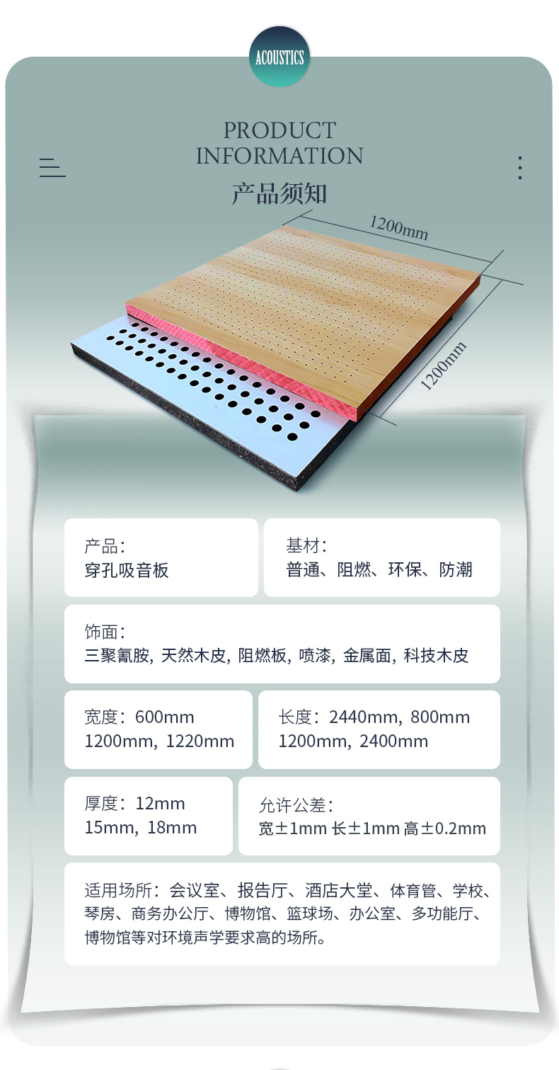 本公司專業(yè)生產(chǎn)木質(zhì)吸音板,布藝吸聲板、吸音軟包、木絲吸音板、聚酯纖維吸聲板、蜂窩陶瓷吸音板、隔音板、空間吸聲體、擴(kuò)散體、隔音材料、干掛板與聲學(xué)活動(dòng)隔斷、固定高隔間等多種聲學(xué)品類。