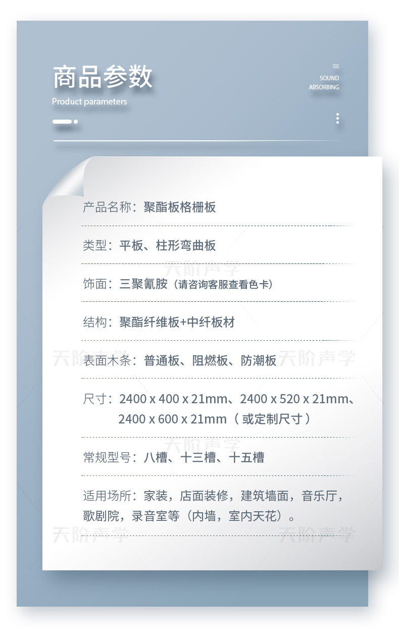 您現(xiàn)在的位置首頁 ? 槽木木質(zhì)吸音板 - 軟包 - 防火吸音板 - 聲學(xué)產(chǎn)品 ? 格柵板背景墻聚酯板格柵板